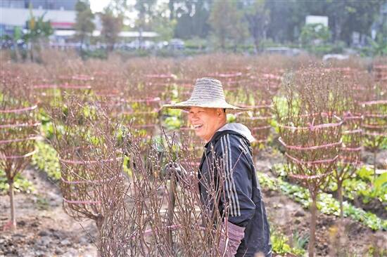 正在花田忙前忙后打理桃花的黎叔今年71岁,家族数代有种植桃花的经验,今年他种植的150-160棵桃花准备上市,已陆续收到熟客的订花电话。