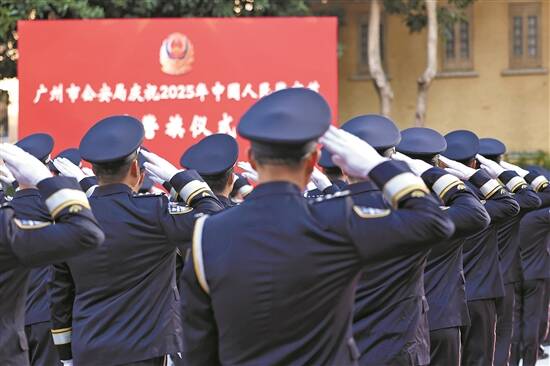 为庆祝2025年第五个中国人民警察节,1月10日上午,广州市公安局在局大院举行升警旗仪式。在家局领导,直属各单位领导及民警代表参加,仪式特别邀请公安部机关锻炼干部、市公安局退休老干部代表、民警家属代表、新警代表等现场观礼。全市11个区公安分局也于当日举行升警旗仪式。
