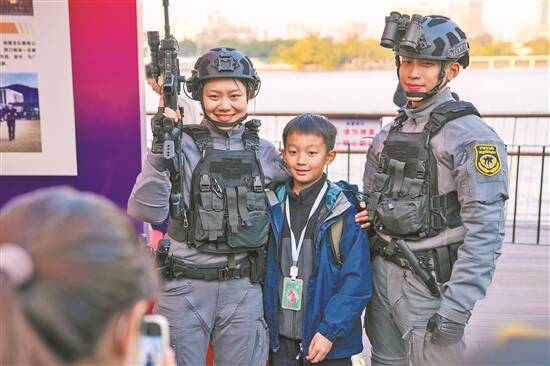 小朋友与英姿飒爽的羊城突击队员合影 羊城晚报记者 梁喻 摄
