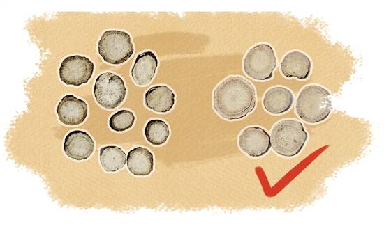 鉴别要点:主要看表面颜色。生晒参表面灰黄色,有疏浅断续的粗横纹及明显纵皱,常带细须根;红参为半透明红棕色,偶有不透明的暗黄褐色斑块,有纵沟、皱纹及细根痕。观察两者的切面,生晒参质地较硬,切面多呈淡黄白色,有棕黄色形成层环纹;而红参质硬而脆,断面平坦,呈角质样。