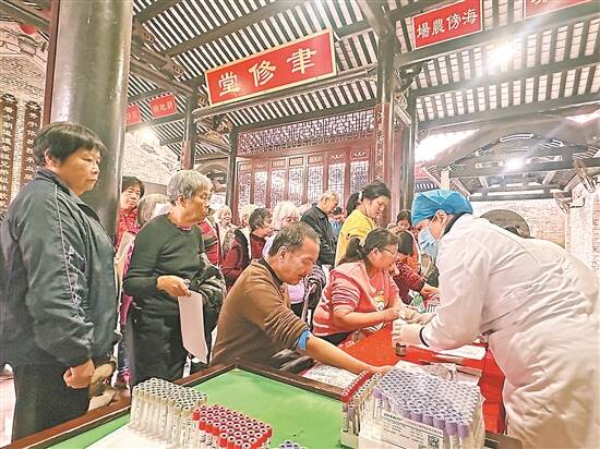 羊城晚报讯 记者张华,通讯员陈柱章、杨耀锌摄影报道:2025年国家基本公共卫生免费体检启动,65岁及以上老年人、慢性病患者可进行免费体检。1月14日上午8时,记者来到广州市番禺区石碁镇莲塘村的黄氏大宗祠,这里社区卫生服务中心的医务人员正在为上百名老人、慢性病患者进行体检。据了解,黄氏大宗祠(聿修堂)有600多年的历史,村里的婚嫁都在这里举行,这次的老人健康体检也选择在这里进行。“老祖宗见了都开心的。”村委会的工作人员笑着说。