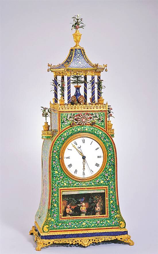 而广珐琅钟的下限,按常理和逻辑推断,应以广东透明珐琅历史的下限即晚清为广珐琅钟的下限。要注意的一点是,宫廷和民间的广珐琅钟在存续时间上的不同。笔者根据两组广东透明珐琅实物提供的相关信息进行推断认为,可将广东透明珐琅市场由以宫廷为主转向以海外和民间为主的时间定在19世纪20年代初期。在此之前的广东透明珐琅都是专门为宫廷生产,相应地,此一时期制作的广珐琅钟也都为宫廷所收藏;在此之后,广东透明珐琅转向民间和海外,此时期制作的广珐琅钟也被排除在宫廷收藏之外,主要面向民间。最后,随着晚清广东透明珐琅技艺的消失,广东民间装饰透明珐琅的钟表也随即销声匿迹。