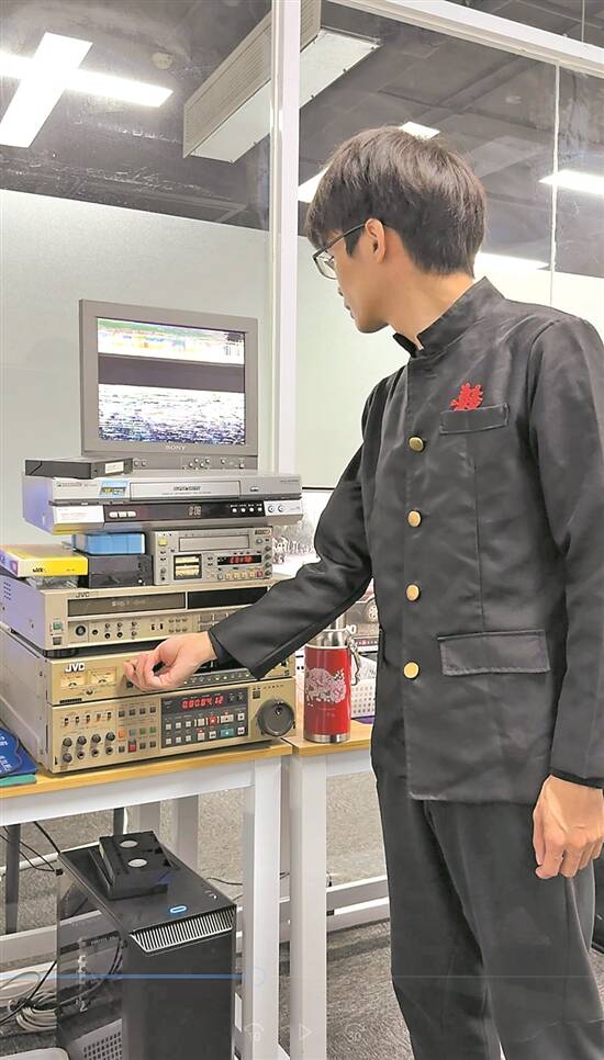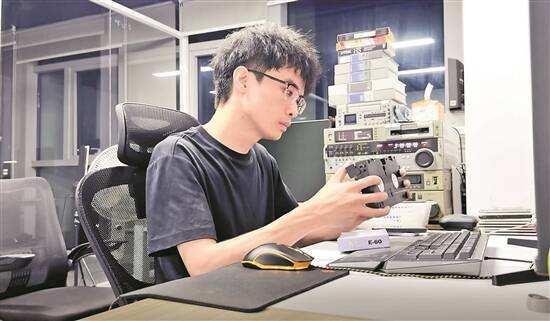 王兴在操作修复废旧录像带的机器