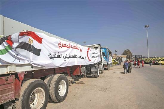 运送援助物资的卡车18日在拉法口岸埃及一侧等待驶向加沙地带 新华社发