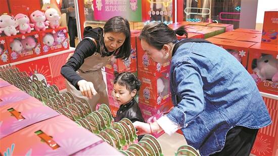 店内人气旺盛,市民们对琳琅满目的十五运会特许商品表现出了极高的热情。一位男士对粉色的“乐融融”毛绒玩具爱不释手,他笑着说:“这个太可爱了,我要买给女儿。”