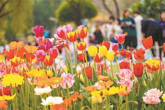 花型独特的郁金香“魔术粉”、花色清新雅致的郁金香“沙龙”、带须边金黄闪耀的郁金香“水晶星”……步入云台花园,20多个品种近12万株郁金香已相继绽放,更有多个郁金香新品种首次在国内展出。丰富多样的各式草花与郁金香相互映衬,结合云台花园独特的台地地形,通过多种造景手法打造了风格迥异的郁金香花田、花境,一步一景,美轮美奂,为游客带来前所未有的视觉享受。