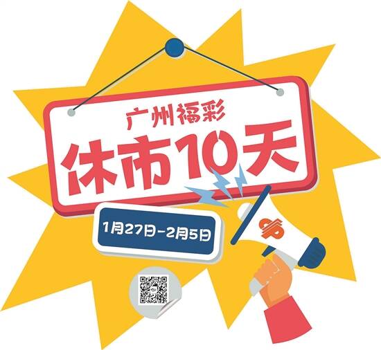 记者从广州市福彩中心获悉,根据2025年福利彩票市场春节休市安排,广州福彩将于1月27日起休市10天,休市时间为2025年1月27日0:00至2月5日24:00。休市期间,除“刮刮乐”即开型福利彩票外,停止其他福利彩票游戏的销售、开奖和兑奖。2月6日(正月初九)起恢复正常销售、开奖和兑奖。彩票兑奖截止时间在春节休市期间的,兑奖截止日期顺延至春节休市后的第一个工作日(2月6日);兑奖期包含春节休市10天的,兑奖截止日期顺延2个自然日。