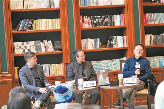 吴青松(中)、严锋(右)在新书分享会上对谈