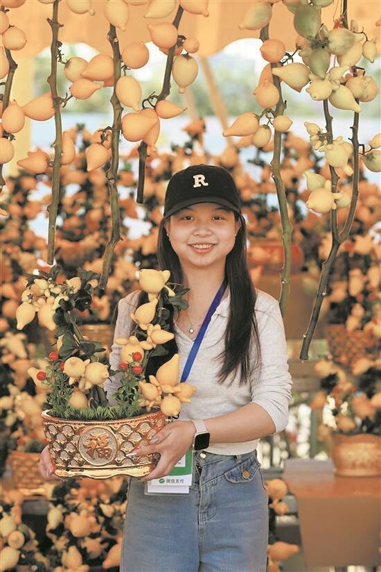 在天河区迎春花市018档位,一盆盆金灿灿的黄金果引来不少市民游客驻足问询,档主黄裕正耐心向顾客介绍。虽然是出生于2006年的“后生女”,她做起生意已经有模有样,完全能够独当一面。