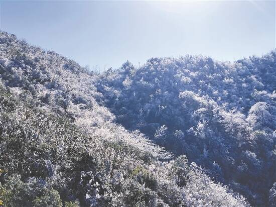 海拔912米的马王殿山山顶成了白茫茫的冰雪世界,茂密的树木披上了银装,树枝上、草丛里,一挂挂雾凇晶莹剔透,在阳光的照耀下,处处都是绝美画卷。