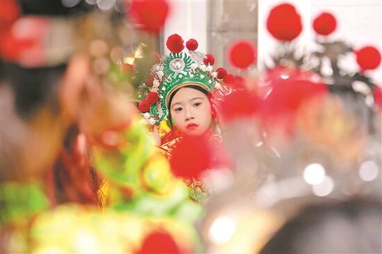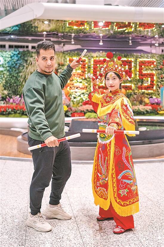 这是除夕前夜,机场内不单聚集了那些踏上归途的游子,还有一群格外引人注目的少女。她们身着鲜艳的戏服,手持英歌棒槌在机场内舞动着,脸上洋溢着自信与期待。