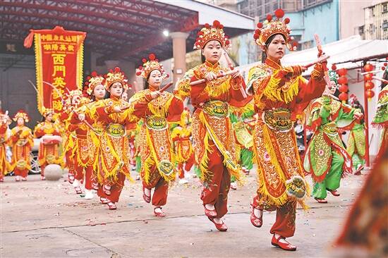 汕头市潮阳区西门女子英歌队在西龙古庙前表演