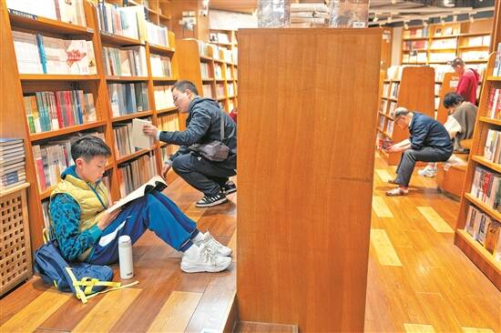 记者在现场看见,购书中心内,火红的灯笼点缀着书架,蛇年主题装饰与琳琅满目的图书相映成趣,不少人漫步其间,或静坐阅读,或精心挑选心仪读物。一位来自佛山的游客李先生感叹:“在商场逛累了,来这儿歇脚翻翻书,既能充电又能感受年味,这种氛围很独特!”