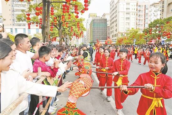 当天下午,由省级非遗保护项目“高脚狮”和多项市级、区级非遗保护项目组成的表演队伍从电城镇政府出发巡游表演,巡游队伍所到之处,欢呼声、叫好声此起彼伏,巡游路线两边街道挤满了围观的群众,不少市民拿起手机拍照打卡,记录下精彩的瞬间。活动还通过直播,将浓浓的年味和精彩的非遗表演传到更远的地方。