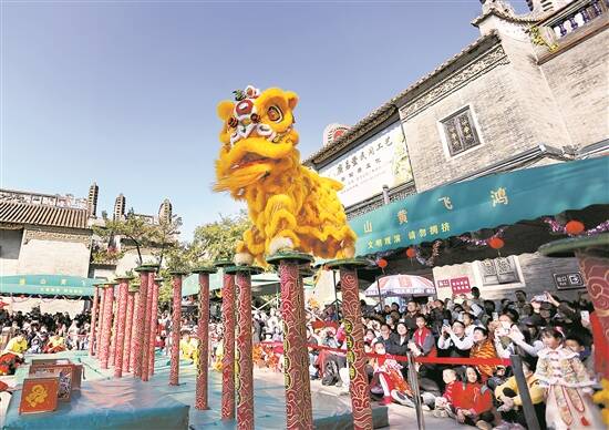 佛山黄飞鸿狮队在佛山祖庙景区进行梅花桩表演 新华社发