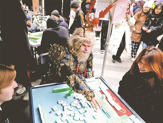 今年,伦敦卡姆登集市首次举办了中国春节庆典活动。喜庆的春节灯饰高高悬挂,在微风中轻轻摇曳;空气中弥漫着中式点心的香气,令人垂涎欲滴。人群中,偶尔可见汉服衣袂翩然掠过,许多人手中还拿着红色的灯笼和“福”字。在庆典活动上,当地市民珍妮·米尔沃德一边喊着“碰”,一边开心地将麻将桌上的“南风”牌收到面前。她不仅自己打得得心应手,还不时给身边的新手讲解规则。