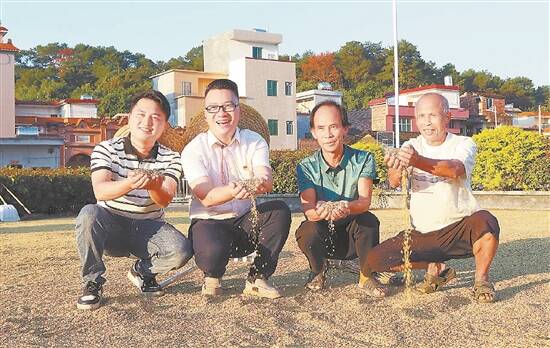 社会工作观察员袁学友(左二)深入田间地头,了解村民急难愁盼问题,推动家乡产业发展