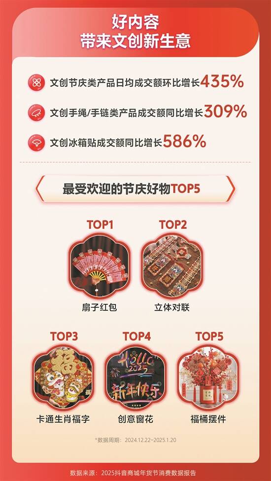 除了吃喝,如何扮靓居室迎新年,也是年轻消费者关注的话题。一批结合传统文化与现代元素的“国货潮品”登上文创年货的C位。数据显示,大促期间,文创节庆类产品日均成交额环比增长435%,其中,手绳和手链类产品成交额同比增长309%,冰箱贴成交额同比增长586%。在大量优质短视频和直播内容推介下,含有“蛇”元素的扇子红包、立体对联、卡通生肖福字、创意窗花、福桶摆件成为最受欢迎的五大节庆好物。
