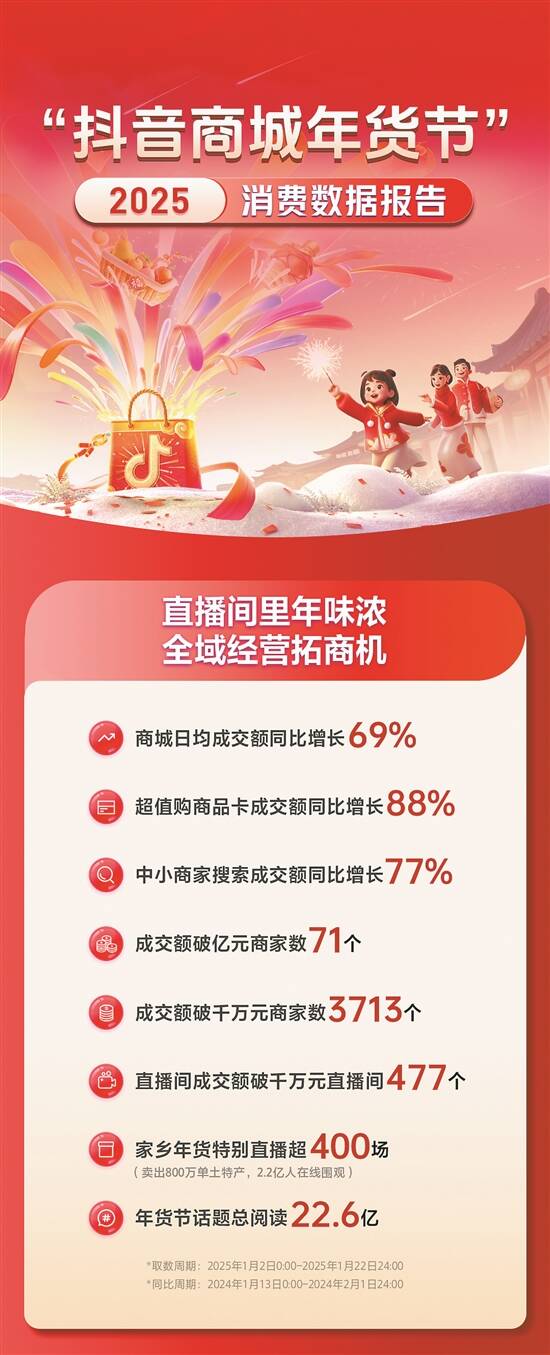 1月24日,“抖音商城2025年货节”数据报告(以下简称“报告”)发布,呈现蛇年春节年货销售情况及大众购买偏好。数据显示,1月2日至22日,抖音商城日均成交额较去年同比增长69%,超值购商品卡成交额同比增长88%,中小商家搜索渠道成交额同比增长77%。辞旧迎新之际,年货市场供需两旺,众多商家借力年货节迎来生意增长。本次大促期间,71个商家成交额破亿元,3713个商家成交额破千万元。