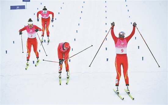2月8日,李磊(右一)冲过终点后庆祝夺冠