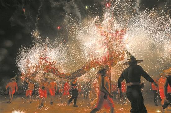 随着夜幕降临,表演正式开始。绚烂的烟花划破星空,火树银花绽放。舞龙队青年们头戴插着石榴花仙草的竹笠,仅穿短裤,赤膊上阵。他们先举着长龙绕场一周,然后点燃火龙,灵活地绕场游动,龙珠在前祥龙在后,时而翻飞,时而盘旋,火花飞溅,硝烟弥漫,巨龙如腾云驾雾一般。在烟火熄灭前,队员举着龙头追上龙尾,首尾相撞,火光四溅,队员齐声欢呼,场面震撼,展现出高超的表演艺术。火龙退场之后,火凤凰、火鲤鱼又接连上场,让人目不暇接。