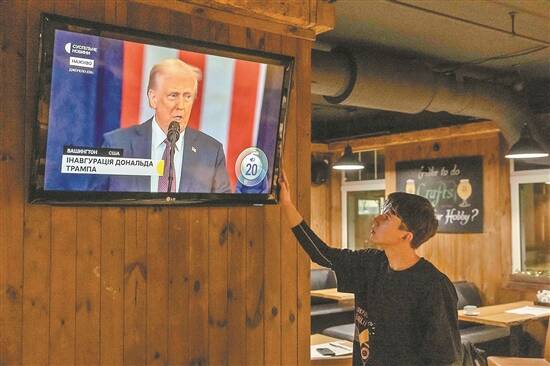 当地时间1月20日,乌克兰基辅,一名餐厅员工调整电视屏幕,屏幕上正播放着特朗普的就职典礼 视觉中国供图