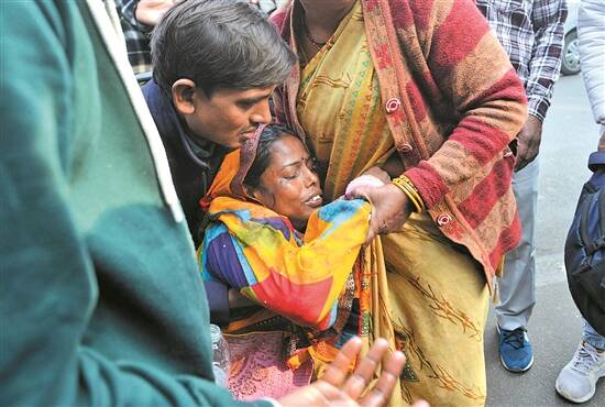 2月16日,踩踏事件遇难者亲属在印度首都新德里的医院外悲痛不已 新华社发