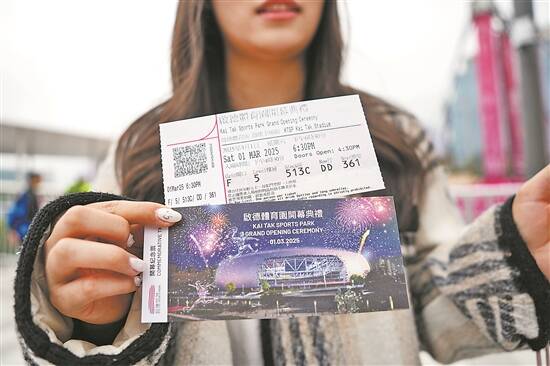 启德体育园的开幕备受瞩目,2月21日上午10时开票后,购票页面显示一度超13万人排队购买,开票后约半小时售罄。图为现场观众展示门票 羊城晚报记者 蔡嘉鸿 摄