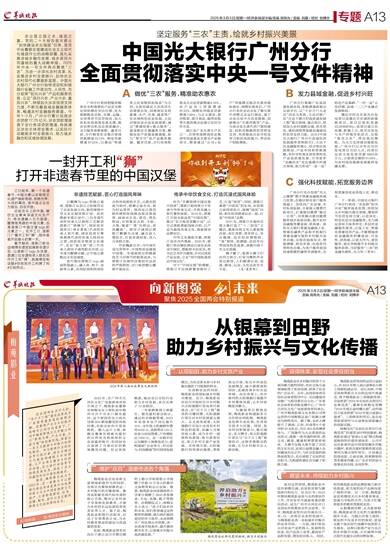 农业是立国之本、强国之基。党的二十大报告首次提出“加快建设农业强国”任务,是党中央着眼全面建成社会主义现代化强国作出的战略部署,是扎实推进城乡融合发展、城乡居民共同富裕的重大战略举措。2025年中央一号文件再次聚焦“三农”,为进一步深化农村改革、扎实推进乡村全面振兴、加快农业农村现代化擘画新蓝图。中国光大银行广州分行始终坚定和积极践行金融工作政治性、人民性,充分发挥“阳光兴农”产品和服务优势,立足“项目兴农、产业兴农、富民兴农”,持续加大涉农信贷支持力度,不断完善县域金融服务体系,畅通农村金融服务渠道。今年1-2月,广州分行累计投放涉农贷款17.25亿元,涉农贷款增速高于全行各项贷款增速,有效满足涉农主体资金需求,以实际行动赋能乡村全面振兴,助力城乡融合和区域协调发展。