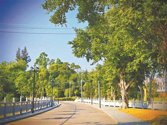 如今,走进唐禄村,农田里的百香果藤蔓爬满支架,平安大道两旁823米长的花岗岩浮雕栏杆在阳光下熠熠生辉,环村路两旁300余棵海南红豆树绵延成带,筑起一道绿意涌动的生态长廊。新建的一体化污水处理设施让昔日家门口的臭水沟“变身”清水流;“振兴议事亭”内,茶香氤氲中传来阵阵讨论声。256盏太阳能路灯在暮色中次第点亮,这条曾经泥泞不堪的村道蜕变为光影交织的网红打卡长廊。