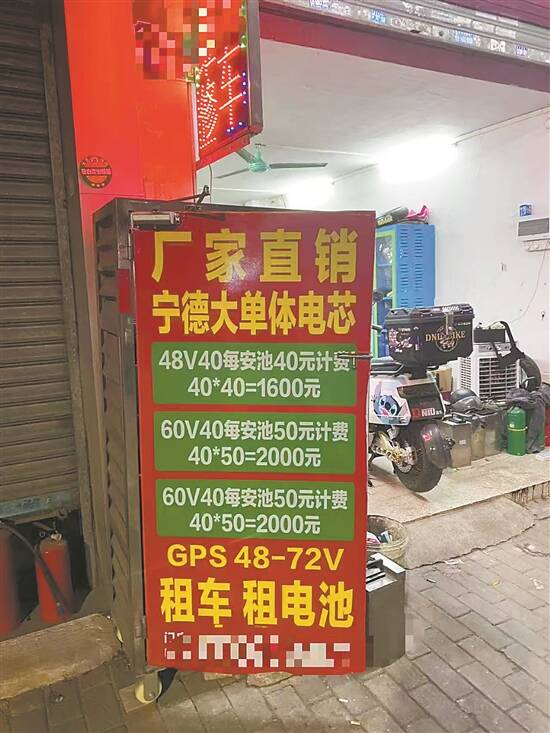 在店铺二楼的仓库里,记者看见地上堆放着数十块外壳贴着“宁德时代”字样的电池,这些电池均由数十块单体电芯拼装而成,“48V的13片电芯,60V的17片电芯,装几片都是能算出来的嘛。”陈先生介绍道。记者以想做换电生意为由与店主陈先生攀谈,询问这么做是否会有风险时,陈先生没有正面回应,而是以“我都开了这么多年了(没出过事)”作答。