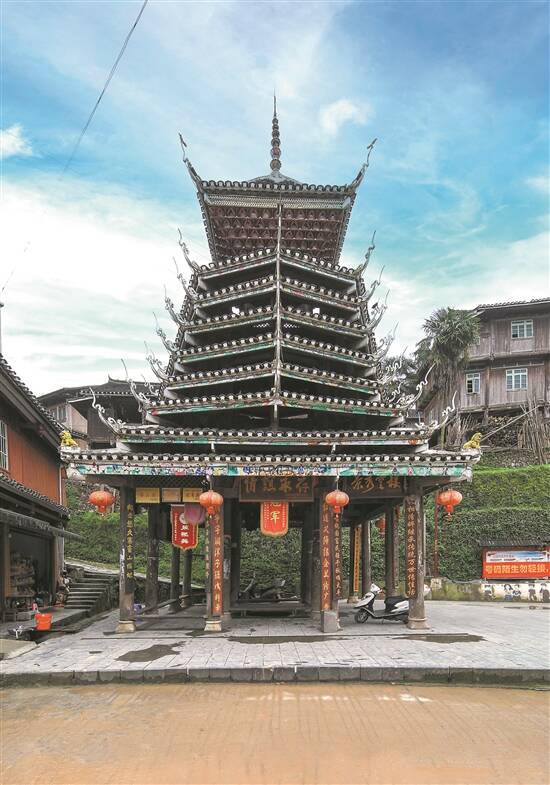 鼓楼,往往位于侗寨的中心位置,是侗民公共集会、议事、庆典、歌舞的场所,是侗寨的标志建筑之一。陆文礼尤其擅长建鼓楼。他创造了侗族鼓楼建筑史上的很多个“营造之最”,比如建造了当今最高的木质结构鼓楼、第一个把侗族鼓楼修建到城市……