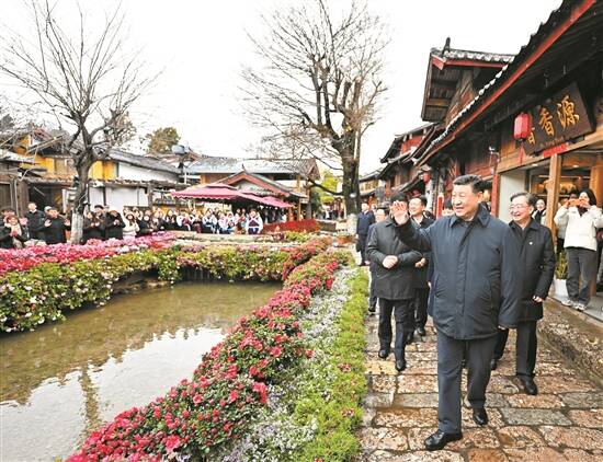 丽江古城有800多年历史,被列入世界文化遗产名录。一场春雪过后,丽江游人如织。习近平来到这里,详细了解古城营建历史、纳西族民居特色和当地文化遗产保护利用、推动文旅融合发展等情况。居民和游客见到总书记十分兴奋,争相问好,有的还弹奏乐器、载歌载舞欢迎总书记。习近平频频与大家互动交流,了解商铺经营状况和游客感受。他要求当地处理好保护和发展的关系,让这座美丽的古城焕发新的光彩。