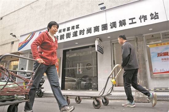 黄国光口中的调解工作站于今年2月18日成立,目的就是为了化解像追讨货款一样的小商品买卖纠纷。“常见的质量、租金、合同问题,不是一次两次能搞定,当事人需要空间坐下来慢慢聊。”调解工作站应运而生,设置在专业市场里,能够就地化解纠纷,将矛盾消除在前端。与此同时,该调解工作站整合劳动监察、法律援助、行业监管等资源,提供解纷、咨询、培训、服务等一站式服务。