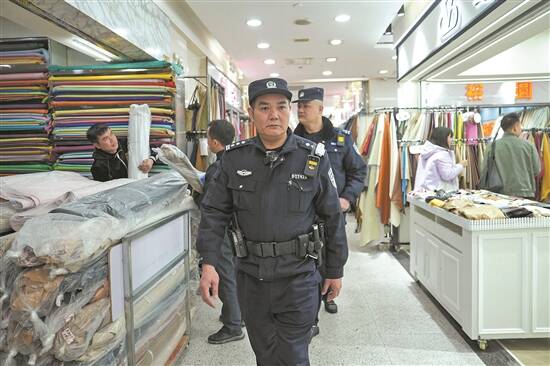 站前派出所民警黄国光(前)带着辅警在鞋业市场开展日常巡逻