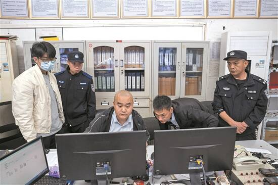 站前派出所民警李国华(右一)带着事主到apM时代国际服装城保安室寻找戒指被偷的线索