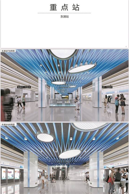 据了解,十号线将以往“一站一色”理念提升为“一区一色”的鲜明风格,根据各区段环境底蕴选取主色调,天河区采用活力朝气的“朝阳橙”;越秀区采用底蕴深厚的“古韵金”;海珠区采用海珠晴澜的“粤绣蓝”;荔湾区采用生态乐活的“生态绿”。主题色应用在墙面、天花,同时对空间进行了优化提升,运用了丰富的灯光变化,呼应了多彩生活的主题。