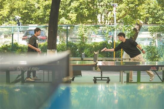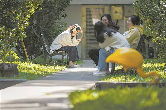 园区内绿树成荫,企业员工坐在树下休闲交谈