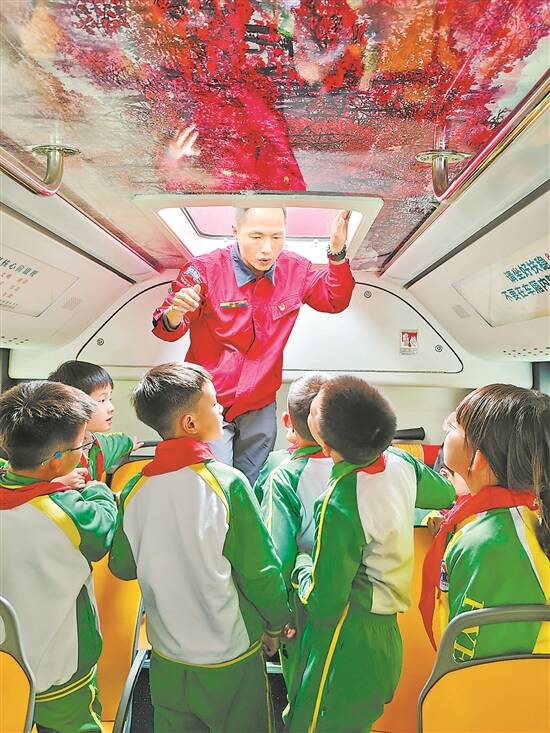 活动特别设置“公交安全实训课堂”,将“英雄花开英雄城”红棉公交开进校园。在“友爱先锋”公交志愿者的指导下,师生们分组学习逃生锤使用、一键破窗装置操作及灭火器规范使用方法。最受学生欢迎的环节当属“公交驾驶室探秘”:在番186路车长杜松柏的带领下,学生们亲身体验驾驶员视角,直观感受车辆盲区分布。“原来公交车转弯时真的看不到行人!”“我以后过马路一定会避开这些区域!”实地体验后,学生们纷纷表示将争做“安全出行小卫士”,将所学知识传递给家人和朋友。