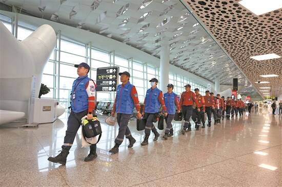 29日16时许,深圳公益救援队22人1犬完成值机后从机场廊桥登机,另1人从北京出发。