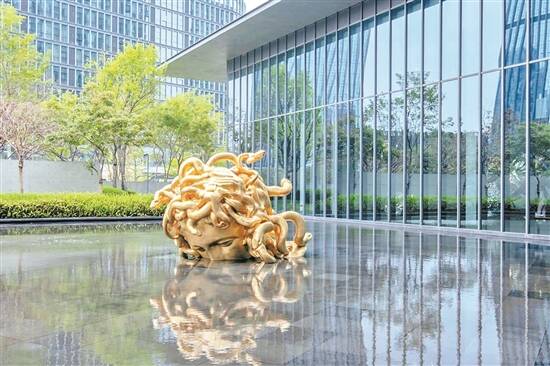 在和美术馆的入口水池中,雕塑《美杜莎的倒影》倒映在水中,美杜莎那双拥有石化他人能力的眼睛,此刻正垂眼望向水面上随水波而扭曲的自我的倒影。作品开启本次展览主题,通过对神话的“祛魅”,观照现代社会中的现状。