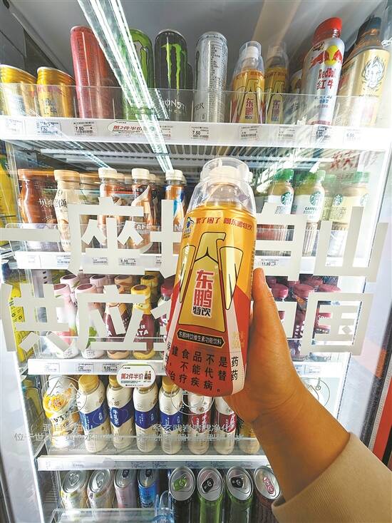 在广州的一家有家便利店里,东鹏饮料、红牛等品牌功能饮料摆在同一排出售