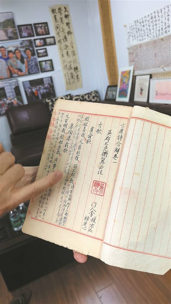 我出生在潮州,祖辈、父辈和哥哥、姐姐,有不少人当教师,家族一直有读书传统和氛围。我从小就喜欢文学,尽管上小学不久就遇到“文革”,但我从未放弃过阅读。家里书很多,我就囫囵吞枣地读,甚至一边抄写一边读,不仅把“文革”前的高中语文课本抄写一通,还抄录了不少古书。我至今保存着1973年抄写的《古唐诗合解》。那是一种特殊的仿古抄写法,先找一些质地较好的白纸,用铁笔、蜡纸在蜡板上刻出线装书的竖行框,再加红色油墨,之后印出一张张带有竖行框的纸。然后,摹仿原书的格式,一字一字地抄。古诗、唐诗用大字黑墨水抄,释文与评点用小字蓝墨水抄,然后钻孔缝线。半个世纪过去了,这本手抄本仍保存完好。这也是我为自己私人定制的第一本“线装书”。