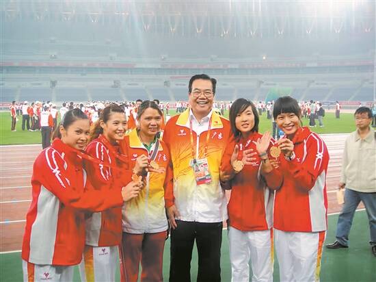 汤晓茵(左二)与教练、队友在第11届全运会上