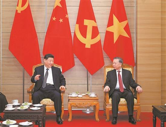 习近平指出,这次访问时间虽短,但活动丰富、成果丰硕。双方重申共同壮大世界社会主义事业的政治意愿,都期待朝着“六个更”总体目标全面推进两国战略合作,都表示抵御外部风险挑战,维护地区和平稳定和国际公平正义。我对中越关系发展前景充满信心。双方要全面落实这次访问成果,持续推进中越命运共同体建设。