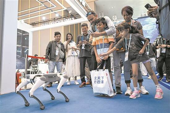 15日,广交会服务机器人专区内,一只机器狗与客商互动