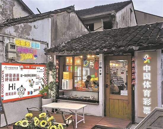 就这样,2024年春天,“体彩+猫咖”正式开门营业了——白墙灰瓦的古朴建筑之间闪烁着色彩明快的体彩标识,雕花窗棂旁张贴着体彩乐小星的宣传海报,一整面墙的体彩公益灯箱中,点缀着“哈基米”“相信自己”“顶呱刮”等字样的霓虹灯标语,既体现着历史沉淀的厚重感,又洋溢着体育彩票与萌宠相结合的活力。