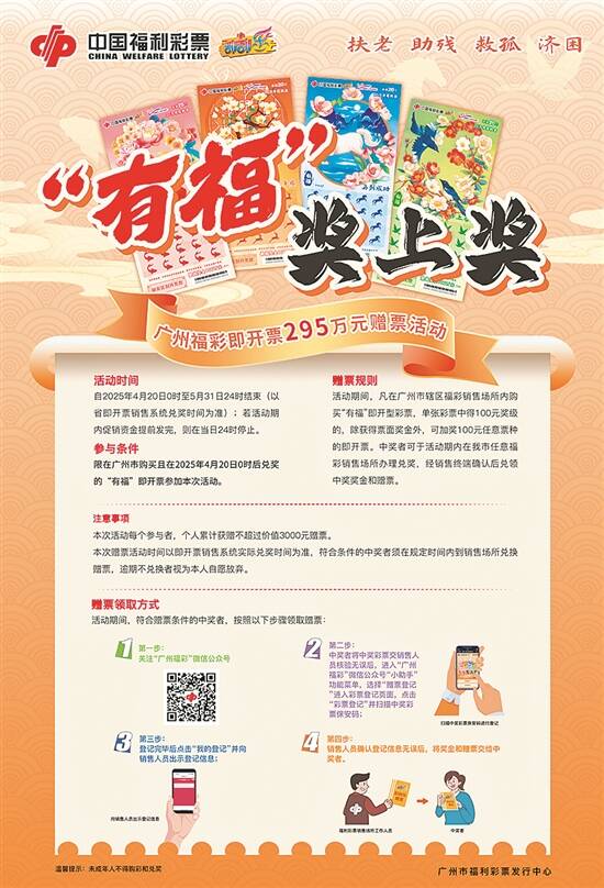 据悉,在广州市福彩销售场所内购买且在2025年4月20日0时后兑奖的“有福”即开票,即可参加本次活动。活动期间,对“有福”即开票单张彩票中得100元的中奖者,除获得票面奖金外,额外赠送价值100元的即开型福利彩票(不限票种)。本次活动每个参与者(参与赠票登记的微信账号)累计获赠的赠票价值不超过3000元。