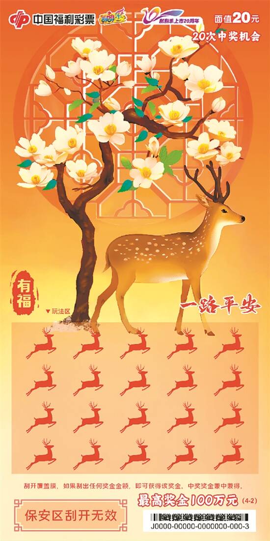 据了解,刮刮乐新游戏“有福”面值20元,一套4枚,分别是“繁花似锦”“一路平安”“马到成功”“喜上眉梢”,选取锦鲤、梅花鹿、骏马和喜鹊为创作元素,搭配牡丹、梅花等吉祥花卉,别具特色的“国潮”风格,洋溢着浓郁的文化魅力。该款彩票共设置9个奖级,最高奖金为100万元,玩法规则也非常简单:刮开覆盖膜,如果刮出任何奖金金额,即可获得该奖金。中奖奖金兼中兼得。