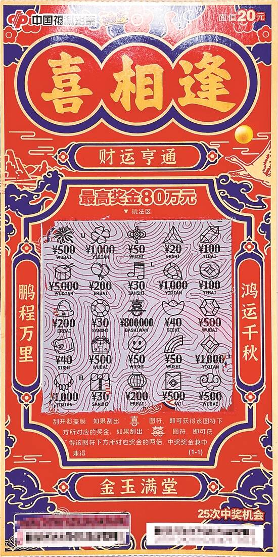 “喜相逢”为系列彩票,面值分别为10元、20元、30元、50元,名称取团圆、美满之意,深受年轻人喜爱。“喜”与“囍”的中奖图符设计,再次呼应“喜相逢”主题,传递“相逢甚喜”“喜事成双”的美好寓意。玩法简单,只需刮开覆盖膜,刮出“喜”图符,即可获得该图符下方所对应的奖金;刮出“囍”图符,即可获得该图符下方所对应奖金的两倍。中奖奖金兼中兼得。
